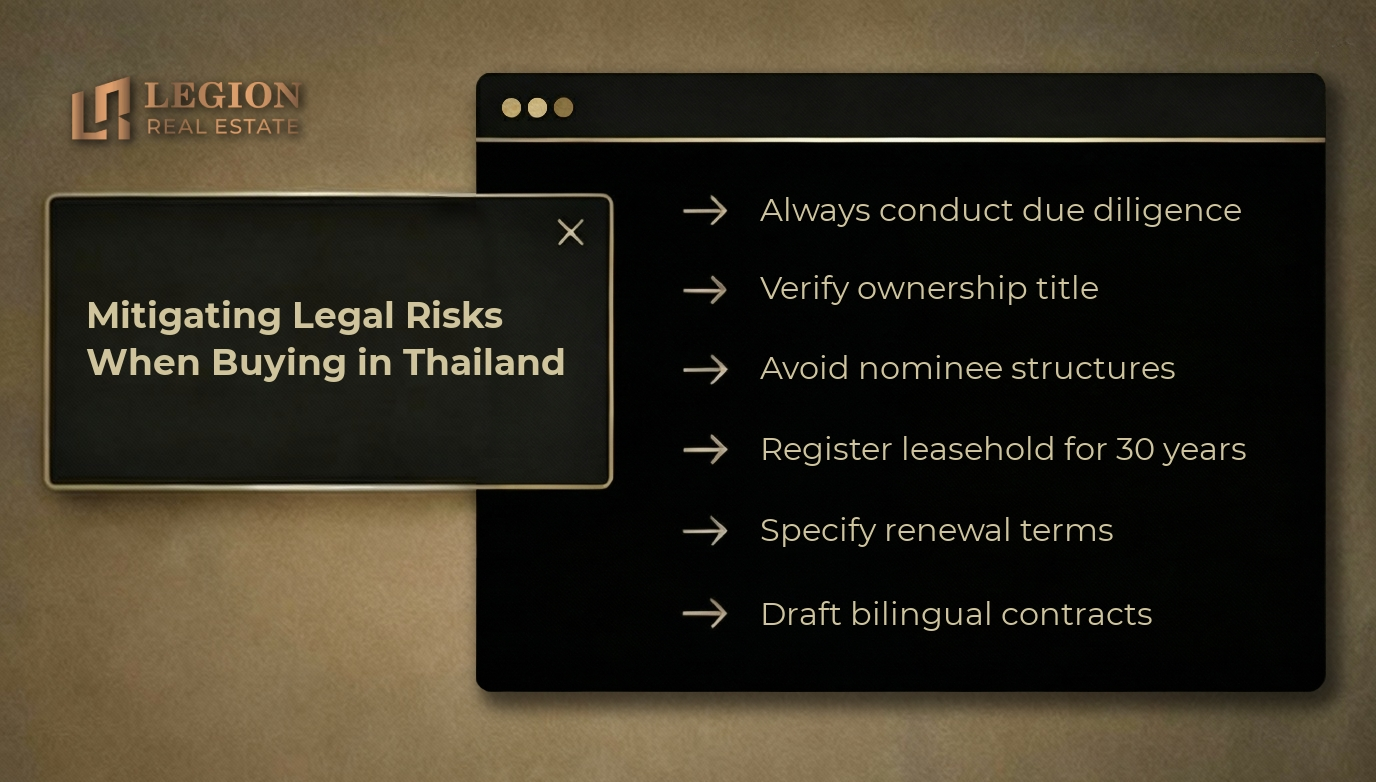 The main legal risks when purchasing property in Thailand include several critical factors. Unregistered lease agreements pose a serious threat because if the land is sold or the landlord dies, such contracts may be challenged by the new owner. Using nominee structures to own land through Thai companies violates the law and can lead to criminal liability, fines, and loss of investment. The absence of clear lease renewal conditions creates uncertainty about the future of the property after the initial 30-year term expires. Insufficient guarantees for inheritance and transfer of rights can limit the ability to manage the asset in the future. Finally, the risk of unfinished development projects may leave investors without both property and funds.