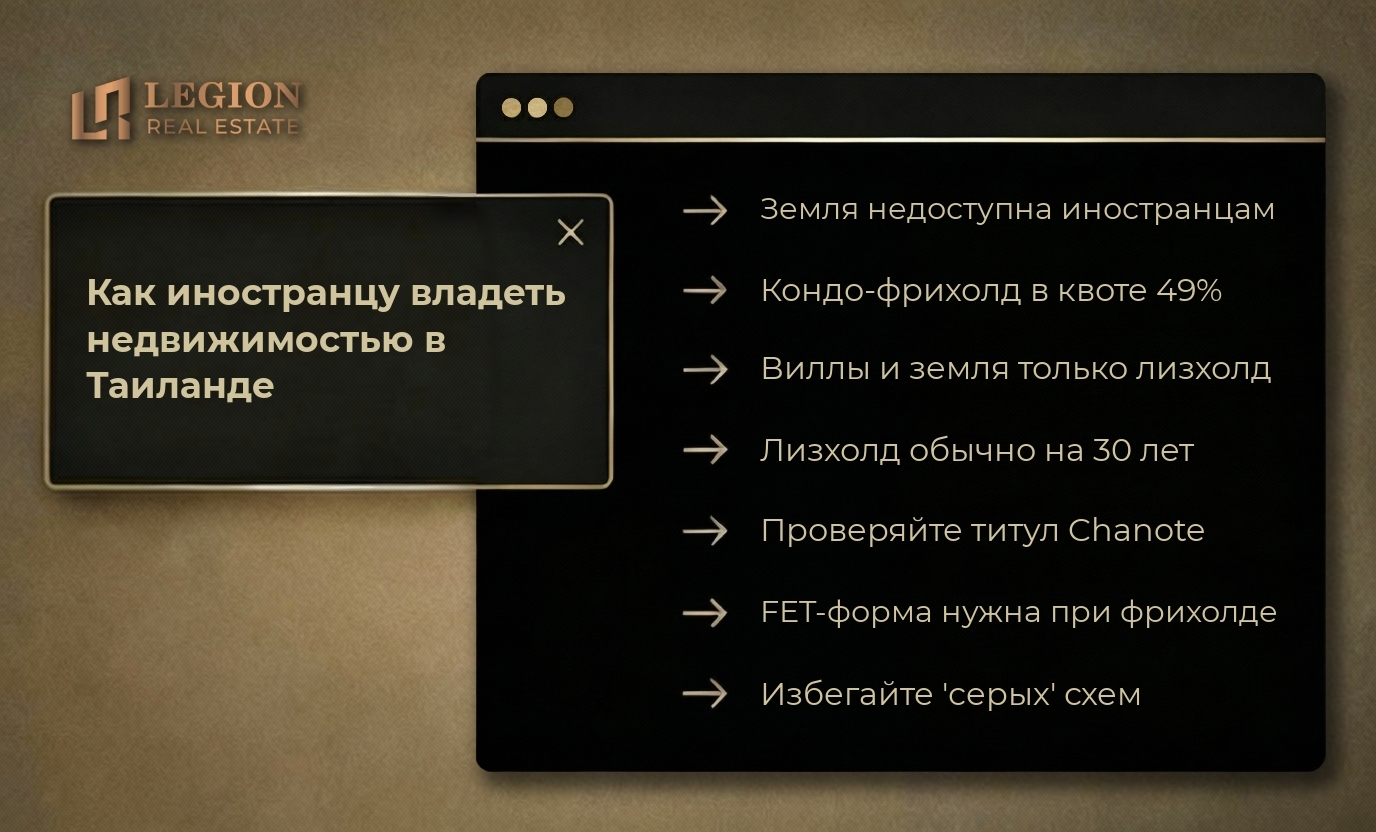 Одна из главных особенностей инвестиций в тайскую недвижимость — специфический правовой режим для иностранцев, который важно понимать, если вы изучаете как купить недвижимость в Таиланде без юридических рисков.
