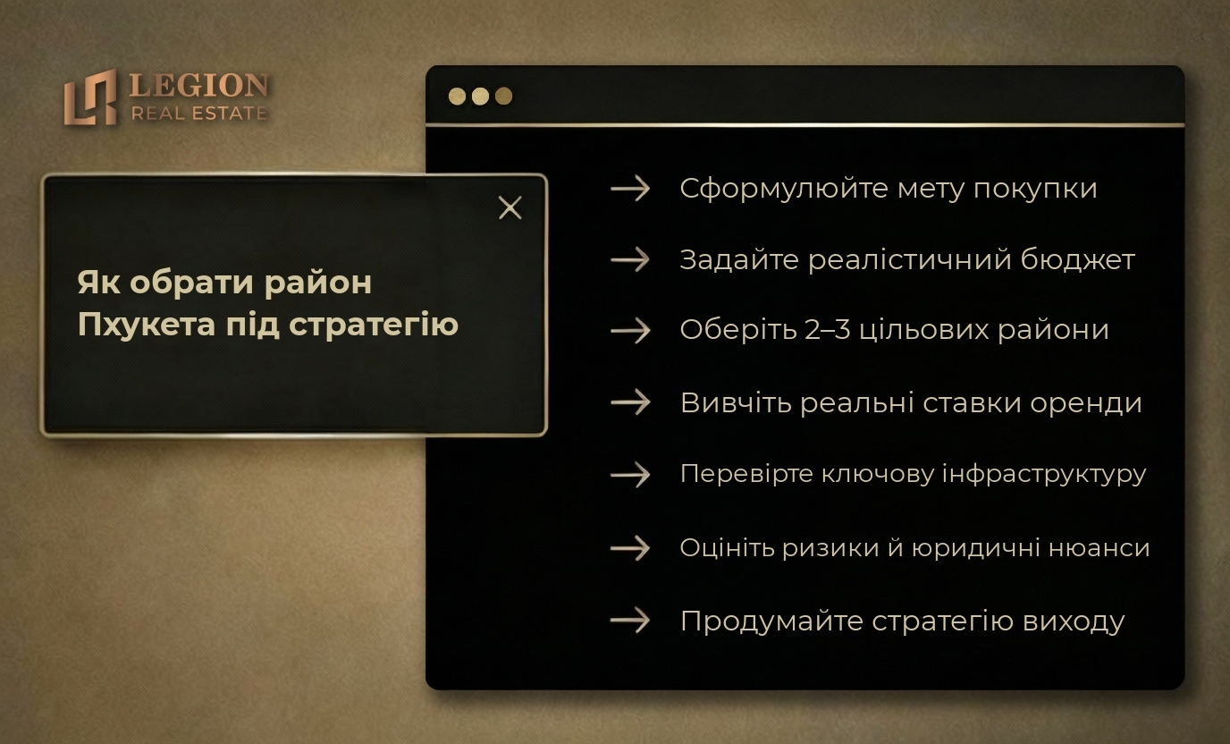 Той самий комплексний підхід, який ми в Legion Real Estate застосовуємо при аналізі локацій на Балі, повністю працює і на Пхукеті: оцінка туристичного трафіку, аналіз інфраструктури, перевірка девелоперів і розрахунок реальної дохідності — це універсальні інструменти для будь-якого географічного ринку. Ставтеся до вибору району на Пхукеті як до серйозного інвестиційного рішення, а не просто як до емоційного вибору красивого місця, і тоді ваша нерухомість стане не тільки джерелом задоволення, але й ефективним елементом інвестиційного портфеля з потенціалом стабільного доходу на роки вперед.